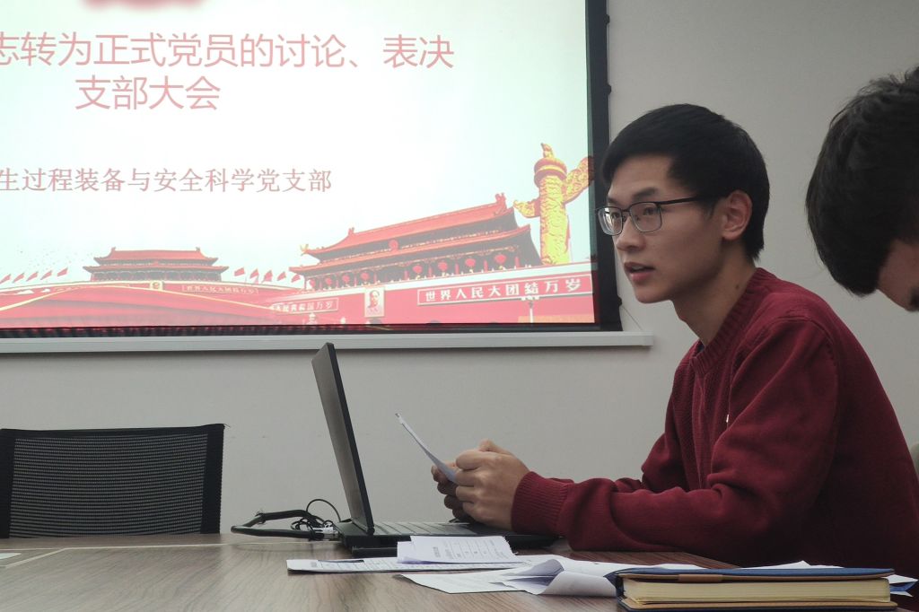 2021年11月25日,研究生过程装备与安全科学党支部就将刘欣同志转为正式党员的支部大会在公司化工楼227会议室开展。本次支部大会由支部书记邓松同志主持。