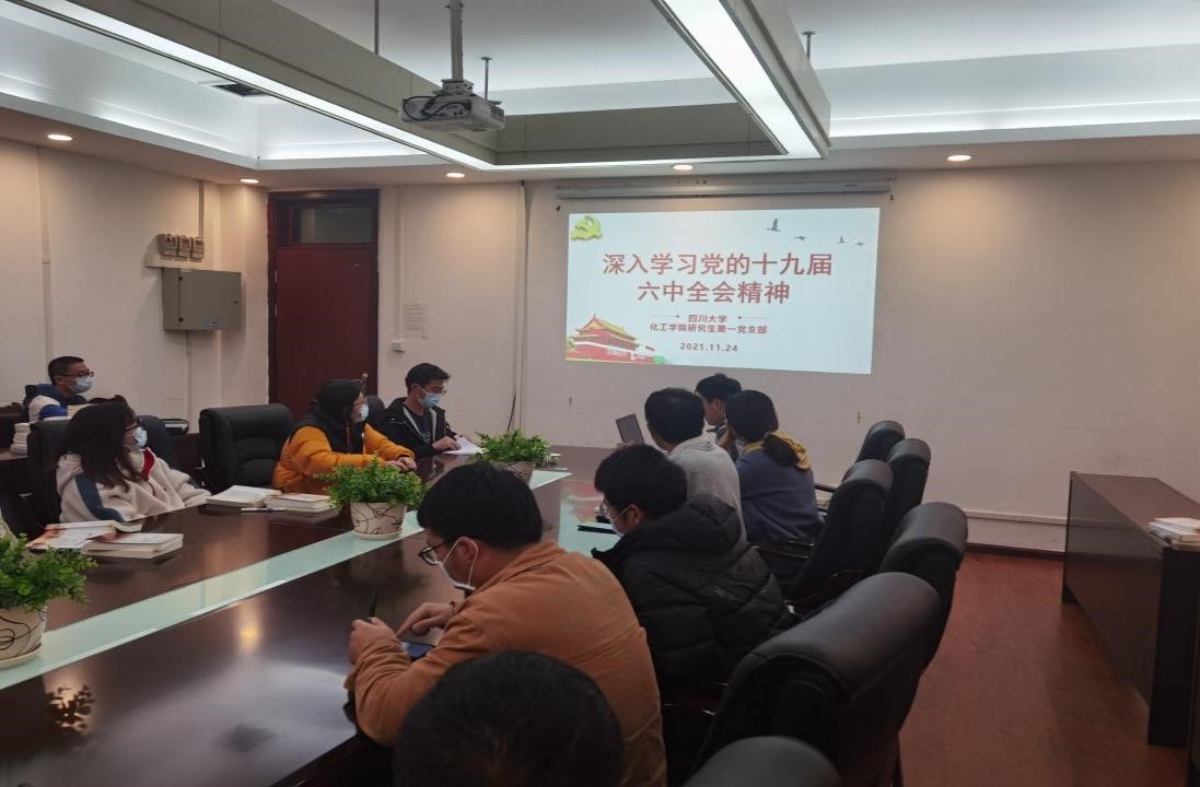 为进一步提高党支部对十九届六中全会精神的丰富内涵与核心要义的理解,2021年11月24日晚上7:00,研究生第一党支部以“深入学习党的十九届六中全会精神”为主题的组织生活会在化工楼235会议室举行。23名党员参加会议。会议由党支部副书记李琪鹏主持。