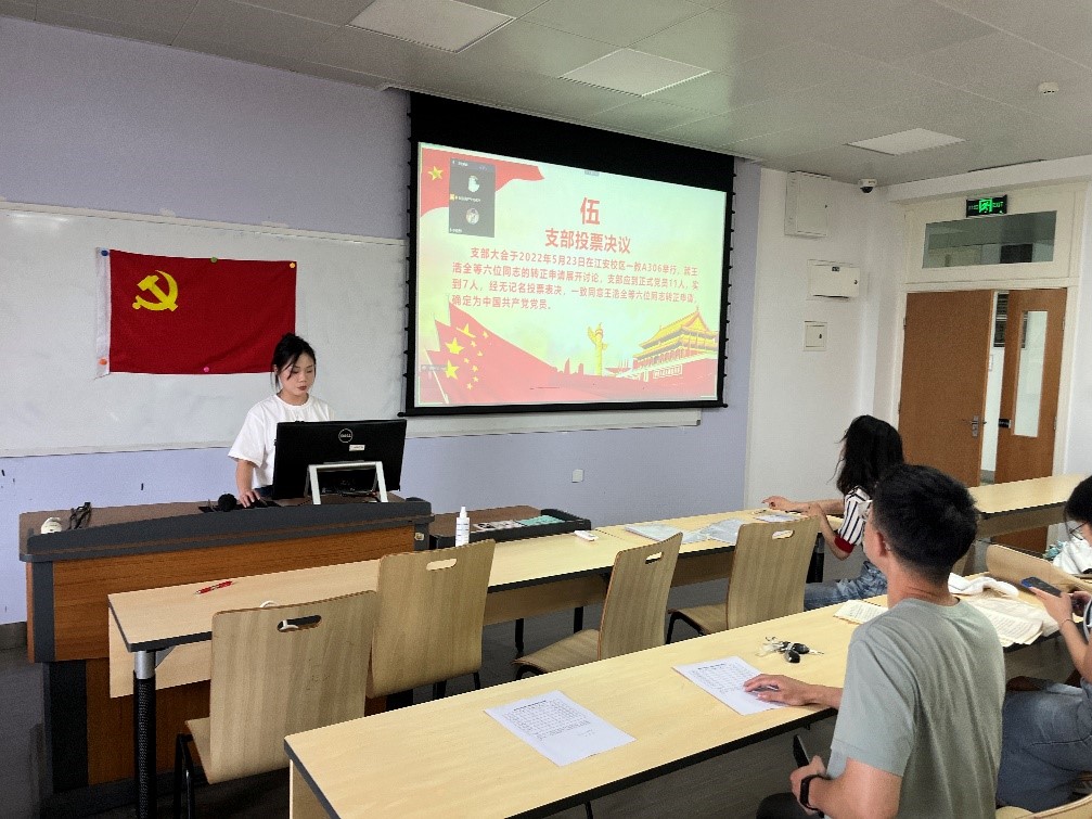 会议开始,首先由王浩全等六位同志自我介绍并总结一年来在思想上、工作上、学习上的进步与不足,并提出了自己的整改措施,端正了入党动机,坚定了自己入党的信念,并向党组织提出申请,申请成为一名合格的中国共产党正式党员。接着入党介绍人对六位同志预备期内的培养、教育和考察情况进行总结。该六位同志认真学习党的先进思想与方针政策,思想上积向党组织靠拢,工作上认真负责,学习刻苦努力,甘于奉献,受到老师同学的一致好评。确认这些同志已经符合成为一名中国共产党正式党员的标准。其后,支部其他成员也发表了意见,肯定了这些同志们的优秀品质,以及在日常表现中赢得的认可。经过无记名投票表决,一致同意王浩全等六位同志按期转为中共正式党员。