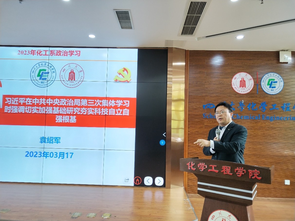 接着,化学工程系系主任袁绍军同志结合2022年度事业发展工作,领学“习近平在中共中央政治局第三次集体学习时强调切实加强基础研究夯实科技自立自强根基”等内容。袁绍军同志结合公司特点,以一线科研人员的身份思考,对学习素材做了深入讨论和例举。他鼓励科研人员静下心,做扎实。他提到,相对于一些兄弟院校,我们在人才培养上还存在一些差距;他例举解读了现行研究生招生管理办法,分析思考如何做到政策透明和公正。