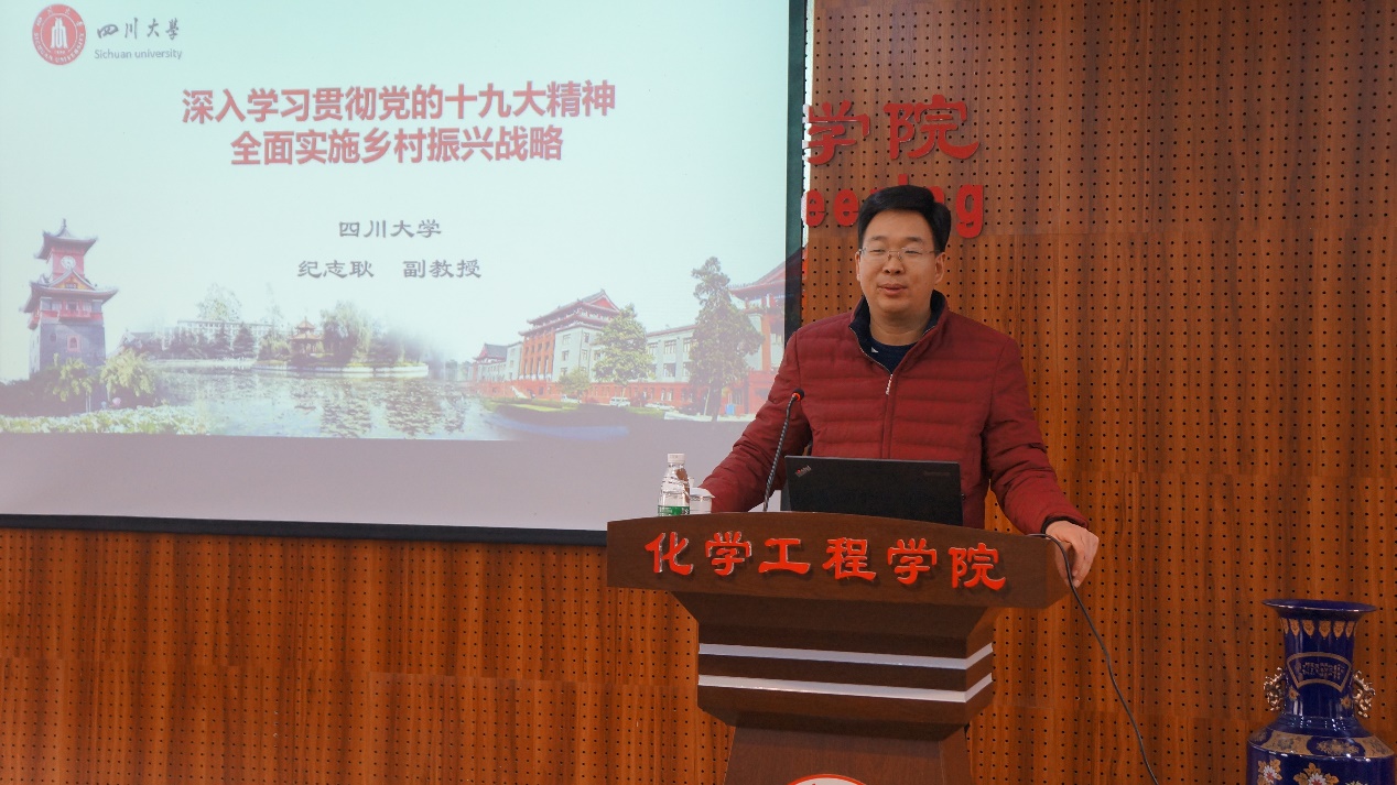 12月21日下午,Mksport体育特邀公司“学习贯彻党的十九大精神宣讲团”成员、Mksport体育app官网入口党委宣传部副部长纪志耿副教授在望江校区化工楼313报告厅举行党的十九大精神宣讲报告会。公司党政领导班子、全院教职工、离退休老同志和部分员工代表等180余人参加了此次宣讲报告会。