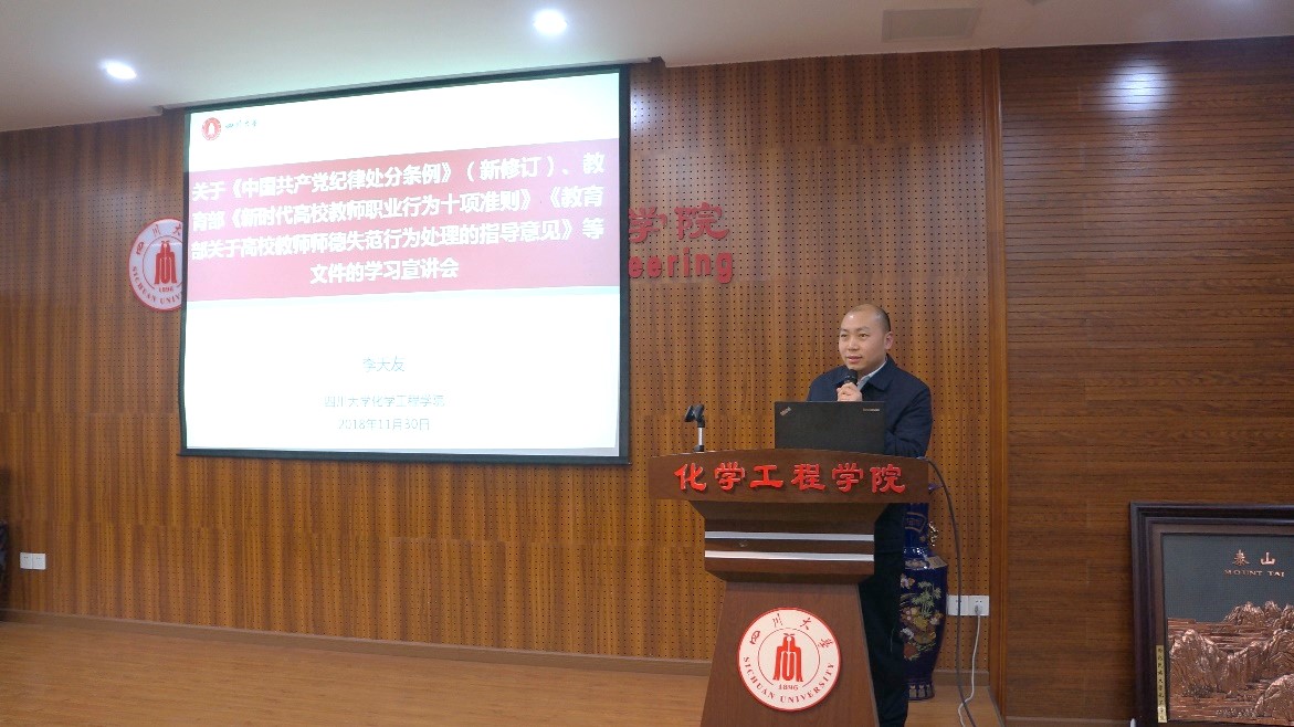 为强化公司党委管党治党主体责任和公司纪委监督责任,加强教师思政工作和师德师风建设,2018年11月30日下午15:30,在望江校区正行楼313会议室,公司党委副书记、纪委书记李天友为全院教师宣讲新修订的《中国共产党纪律处分条例》(以下简称《条例》)、教育部《新时代高校教师职业行为十项准则》(以下简称《十项准则》)和《教育部关于高校教师师德失范行为处理的指导意见》(以下简称《意见》)。Mksport体育全体党政班子成员、工会主席、两委委员和全体教师参加会议。