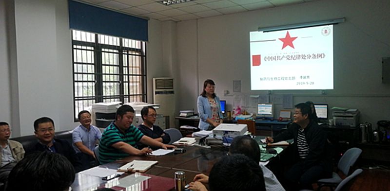 2019年5月28日下午,制药与生物工程系党支部于Mksport体育app官网入口望江校区正行楼114会议室开展“明纪律,守底线”党风廉政学习活动。制药与生物工程系党支部全体党员参加此次学习,会议由支部书记李延芳主持。李延芳同志指出,新版《中国共产党纪律处分条例》从2018年10月起正式实施,相比于之前的15版,新版政治性更强,内容更科学,逻辑更严谨,指导性和操作性更强,需要每一位党员同志认真学习领悟其中的条例要求。