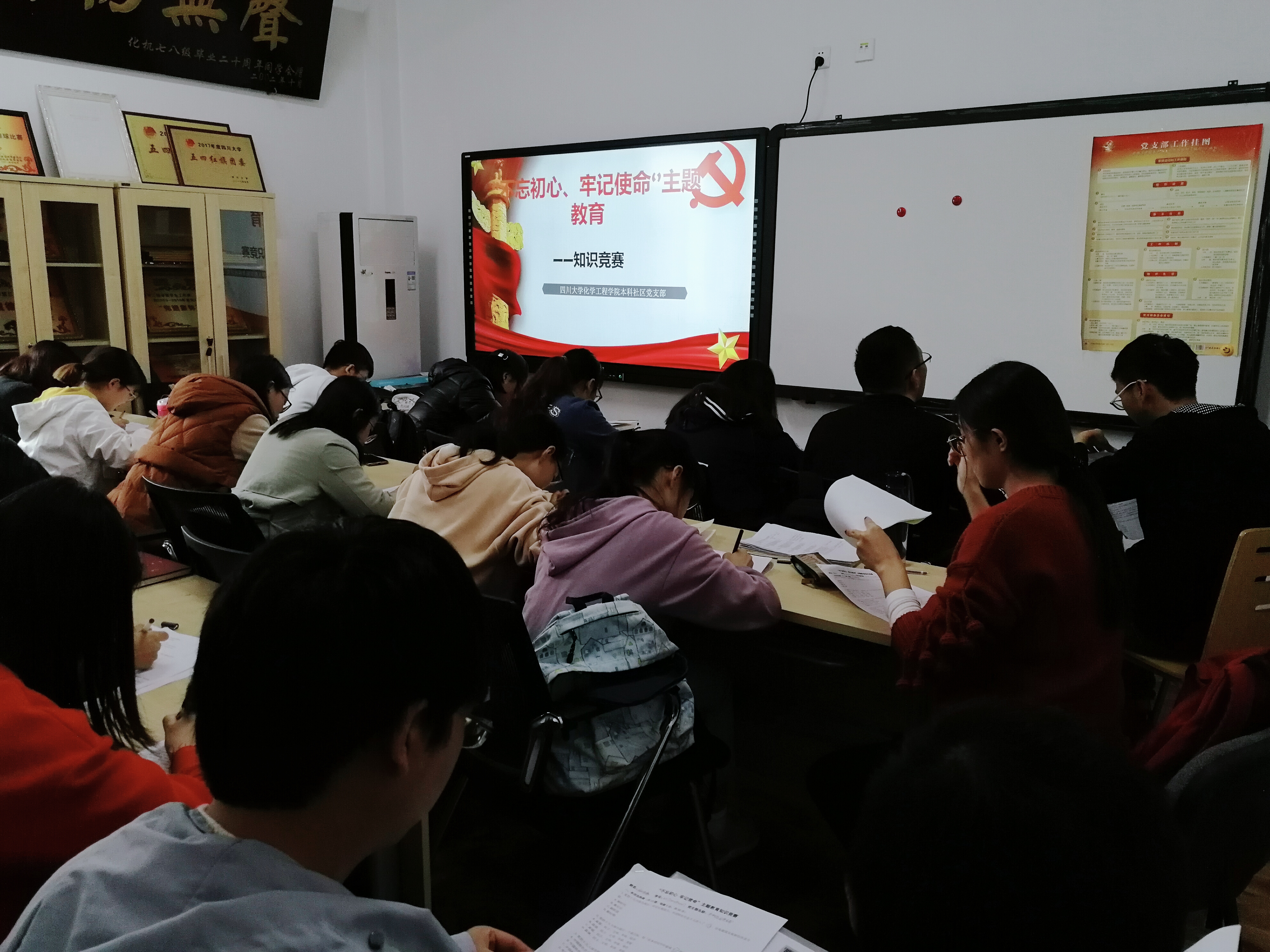 2019年11月1日星期五12:30,在江安校区三舍活动室开展了主题为“不忘初心,牢记使命”的知识竞赛活动,本次竞赛由本科社区党支部主办,2016级本科第一党支部和2016级本科第二党支部协办,在各位同志的积极参与下取得了圆满成功。