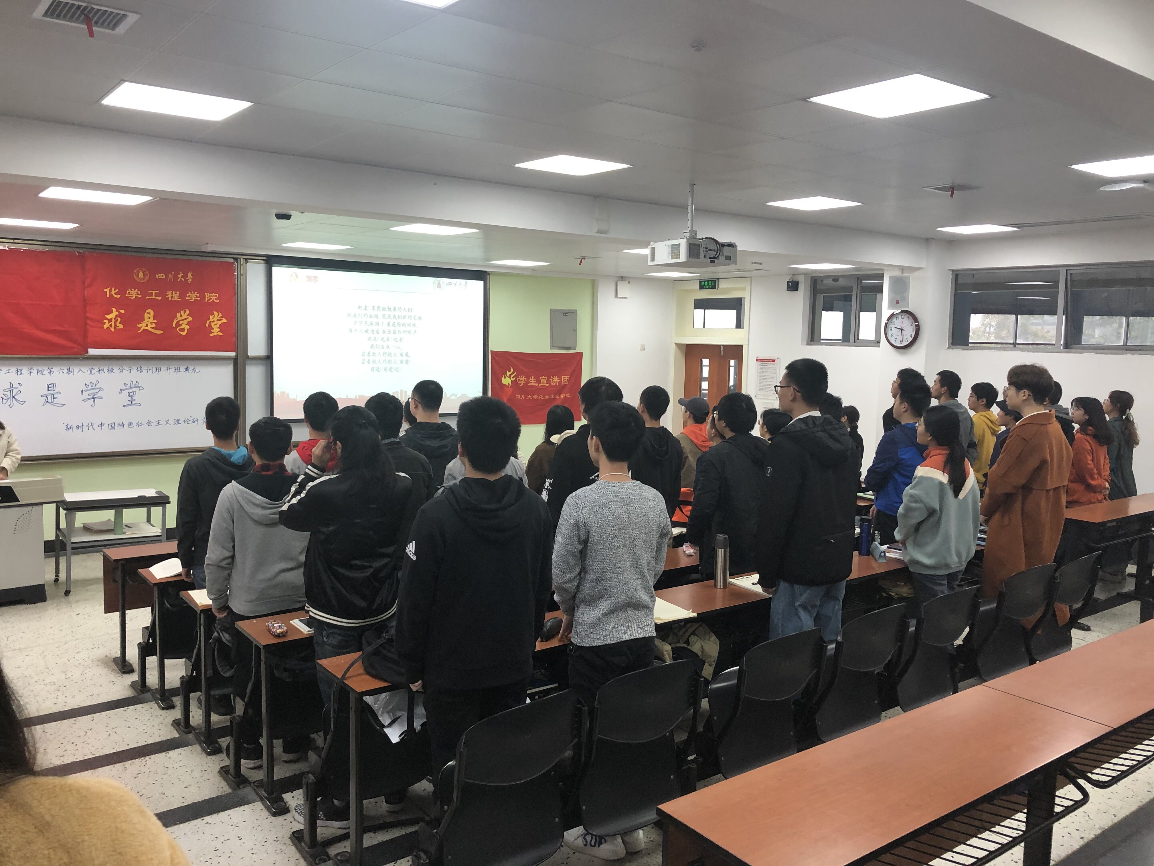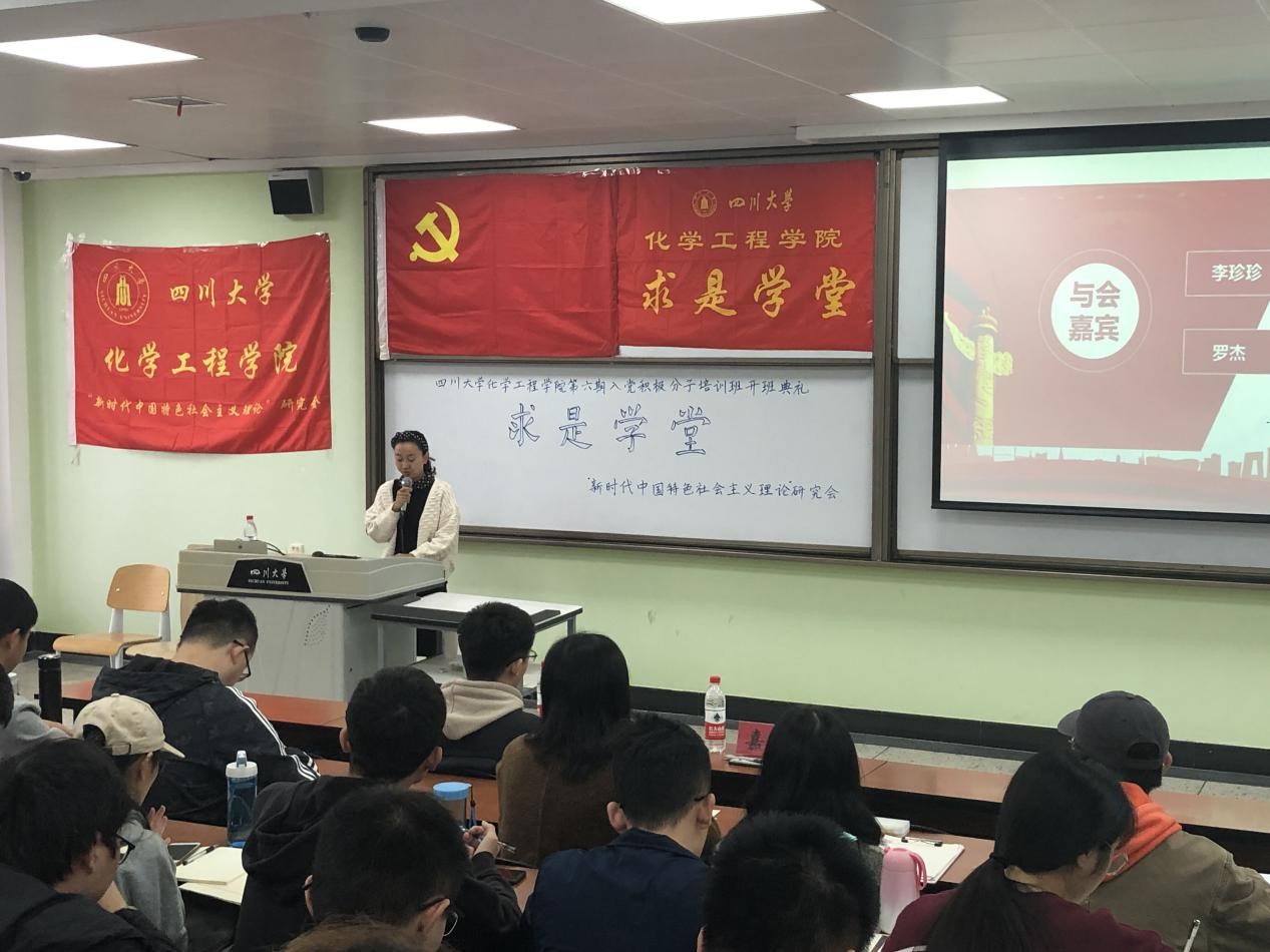 2019年11月16日上午九点三十分在江安校区第一教学楼B座B303教室,成功举办了Mksport体育“求是学堂”第六期入党积极分子培训班开班典礼。此次开班典礼由Mksport体育19级新生冯枭主持,Mksport体育李珍珍老师进行了主题为“不忘初心 明确责任担当,牢记使命 争当优秀党员” 的讲话,优秀学员代表18级员工陈凤进行了主题为“端正入党动机 争做时代新人”的发言。同时参会的还有Mksport体育优秀博士生代表罗杰和59位培训学员。此次培训的目的是以马列主义、毛泽东思想和中国特色社会主义理论体系为指导,学习贯彻党的十九大精神,加强党的基本理论和基本知识的培训学习,坚定共产主义理想信念,使学员进一步树立正确的世界观、人生观、价值观,端正入党动机,明确努力方向,以实际行动争取早日加入中国共产党。
