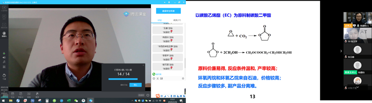 化学反应工程教研组在党员唐盛伟副经理和党员袁绍军系主任的带领下,第一时间梳理了教学计划,多维度丰富课程资源,升级教学硬件,多次谨慎演练授课,保障网络课堂顺利开展。