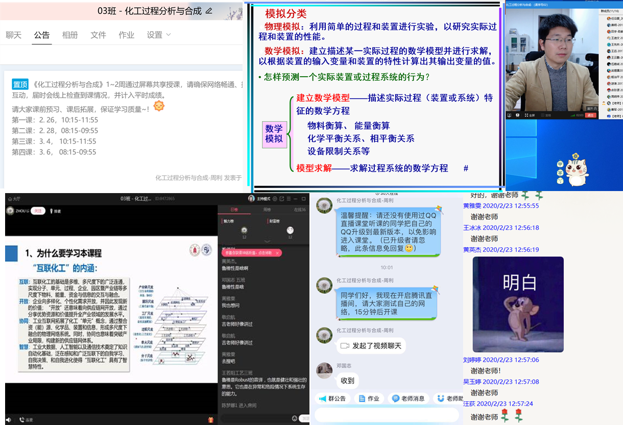 化工过程分析与合成教研组以腾讯QQ直播间为网络授课平台,认真投入“云端”授课教学活动。在首次线上课堂上,教学老师借助直播间开展网络授课,通过屏幕共享功能投放教学课件。师生之间尽管隔着屏幕,但是有这样“热闹”的教学场景,其效果也可谓是不逊于实体课堂了。
