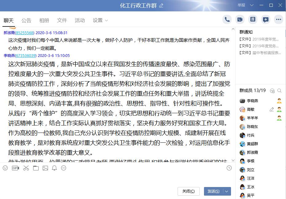 下午3点,公司“化工行政工作群”逐渐热络起来。在高敏老师的主持下,大家结合前期的学习,畅谈自己的学习心得和体会。有的老师说到:“做为公司里面一位普通的行政党员老师,要做好带头作用,积极参与到公司党委组织的抗击疫情工作中,尽一份自己绵薄之力,共迎春天的到来”。有的老师说到:“作为一名普通党员,我们首先要遵守疫情期间相关规定,不给国家添乱;其次,我们要在群众中树立战胜疫情的信心;第三,我们要时刻关注官方报道,学习疫情相关知识,增加对疫情的了解,不胡乱恐慌;第四,我们要学会理性的看待问题,不信谣,不传谣,不添堵;第五,我们要听党指挥,听从指导,干好自己的工作,坚守岗位。”大家纷纷表示,我们要从践行“两个维护”的高度深入学习领会,切实把思想和行动统一到习近平总书记重要讲话精神上来,结合工作实际,认真抓好贯彻落实,坚决有力服务好党和国家工作大局。