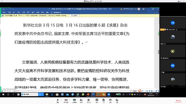 疫情中的新学期已经过去了近一个月,化工的老师们克服各种困难,利用慕课、网络等各种资源,有条不紊的开展了教学、科研各项活动。3月20日,化工系党支部通过腾讯会议组织了本学期的第二次政治学习,探讨了疫情期间老师们的工作经验,布置了近期的主要工作,深入认真学习了习近平总书记关于疫情期间对于年轻党员的鼓励和对科技工作的要求系列通知精神。