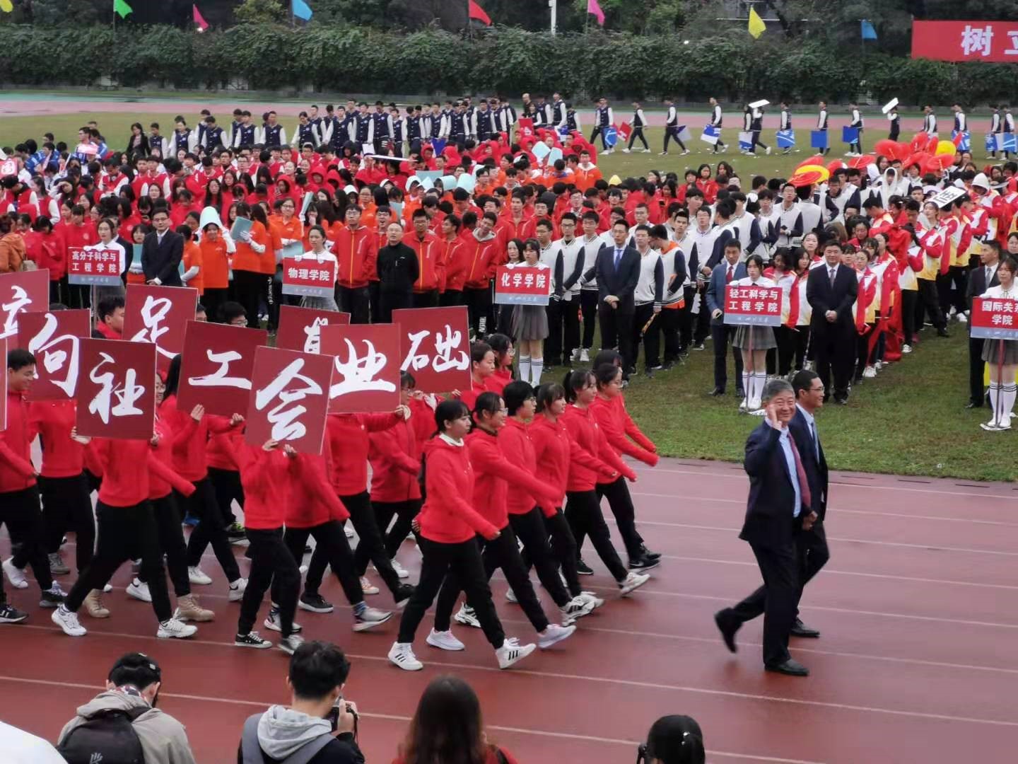开幕式现场举行了运动员方阵入场式。Mksport体育方阵由党委书记庞国伟和经理赵长生领队。同学们踏着整齐的步伐依次步入会场,他们精神饱满、气宇轩昂,“立足基础、面向工业、服务社会”12个字更是体现了化工的优良传统和川大化工人良好的精神面貌。