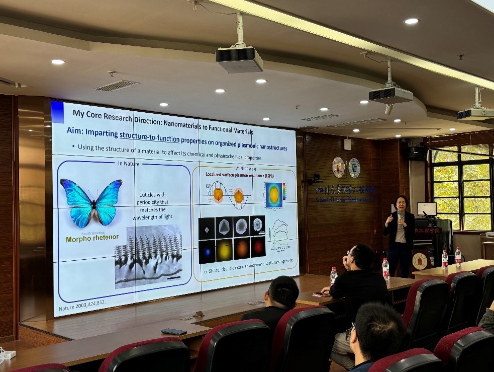 林歆怡教授主要从事形状可控的贵金属纳米粒子自组装超晶格,以及在环境、医疗保健和催化领域中应用纳米颗粒与表面增强拉曼散射(SERS)技术的基础研究工作。讲座上,林教授向大家介绍了自己从纳米材料到功能性材料的的核心研究方向和SERS技术的基本原理,并强调了其在化学分析、生物和环境监测等方面的广泛应用。随着报告的深入,林教授展示了对于传统SERS的增强策略,并提出了智能化的解决方案。