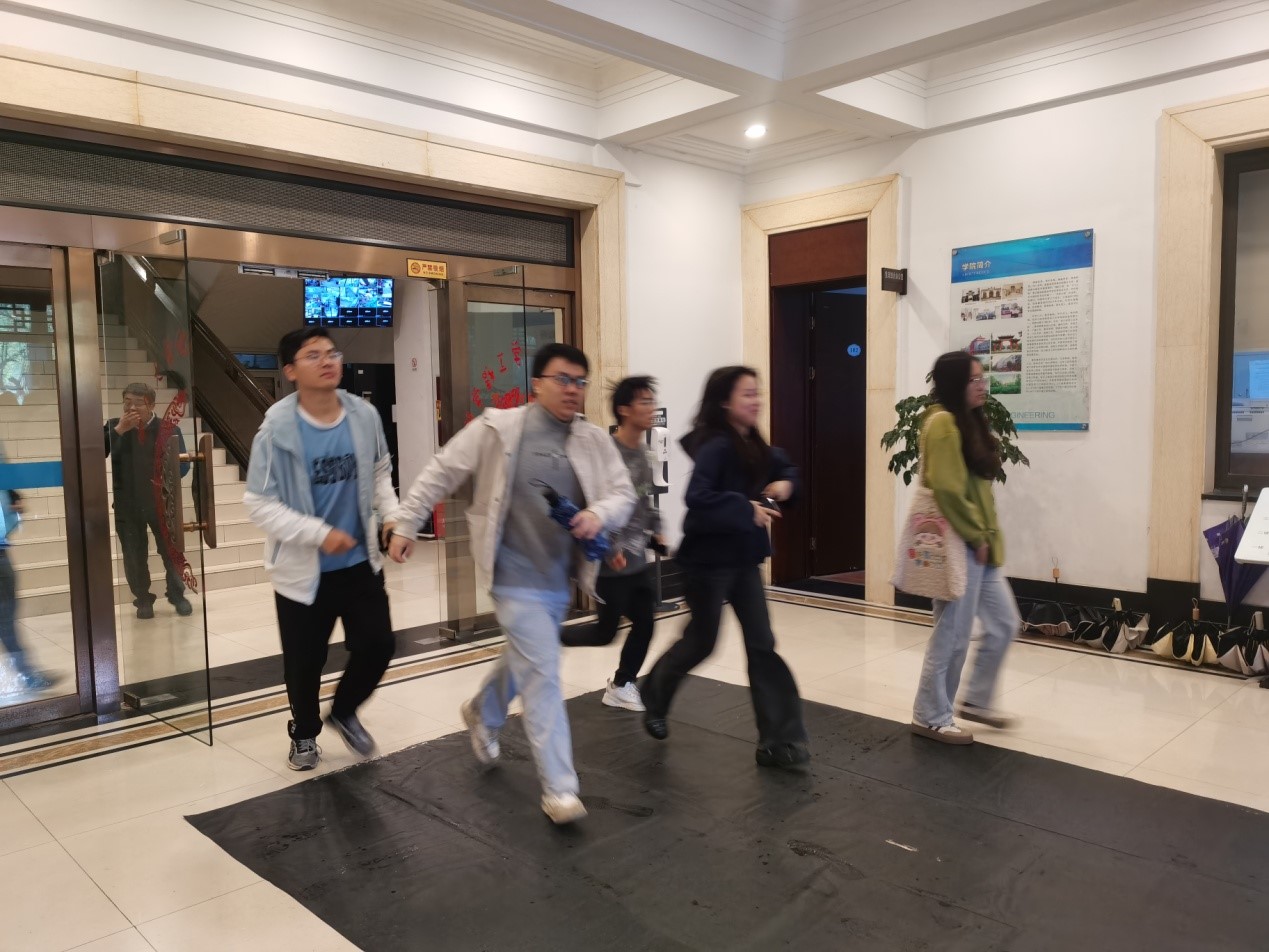 下午17:00,演练总指挥李德富宣布火灾疏散逃生演练活动正式开始,各小组队长根据参演预案,分工明确,配合默契,有条不紊地迅速组织同学们逃生疏散,及时逃离了模拟火灾现场。最快逃生至安全区域的小组用时51秒,全员撤离时间共计1分20秒。