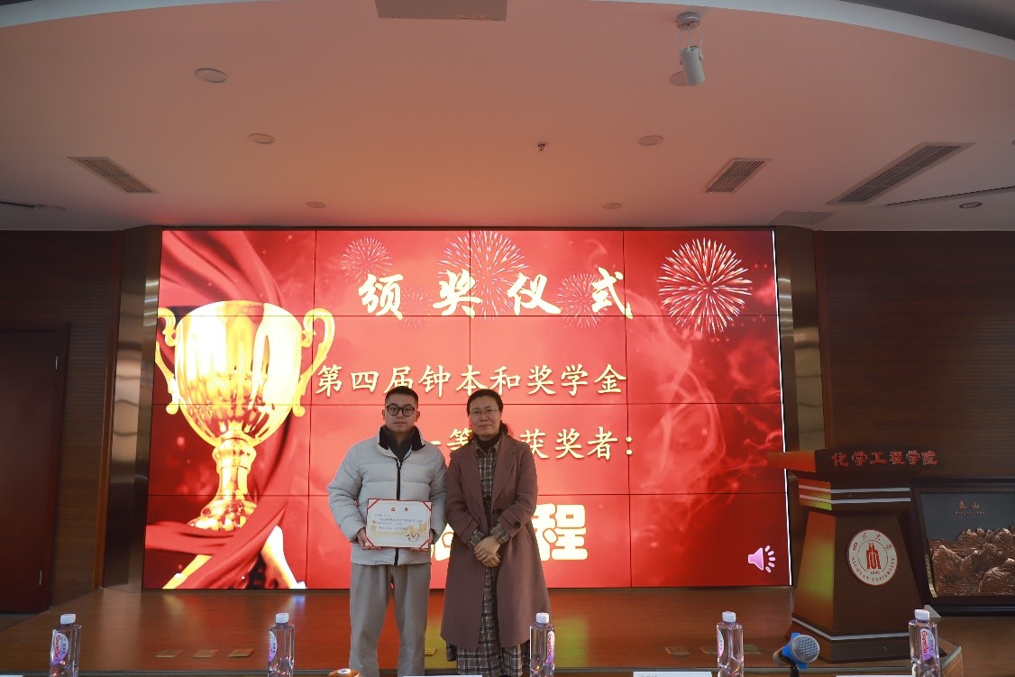 2020级博士研究生张龙程作为获奖员工代表发表感言。他表示“钟本和奖学金”是一份崇高的荣誉,更是一种激励,自己作为新一代的化工学子要正确认识化工、热爱化工,用专业的知识和能力投入到祖国未来的发展建设中去。