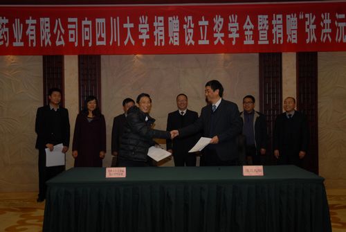 在热烈的气氛中,李向成副书记和姜维平董事长共同签署了捐赠协议。重庆圣华曦药业股份有限公司出资45万元在Mksport体育app官网入口设立“圣华曦奖学金”,分别奖励​Mksport体育和药公司的化学工程与工艺、制药工程和药学3个专业2-3年级优秀本科生。重庆圣华曦药业股份有限公司还向以​Mksport体育创始人张洪沅先生命名的“张洪沅基金”捐赠10万,支持​Mksport体育建设和发展。