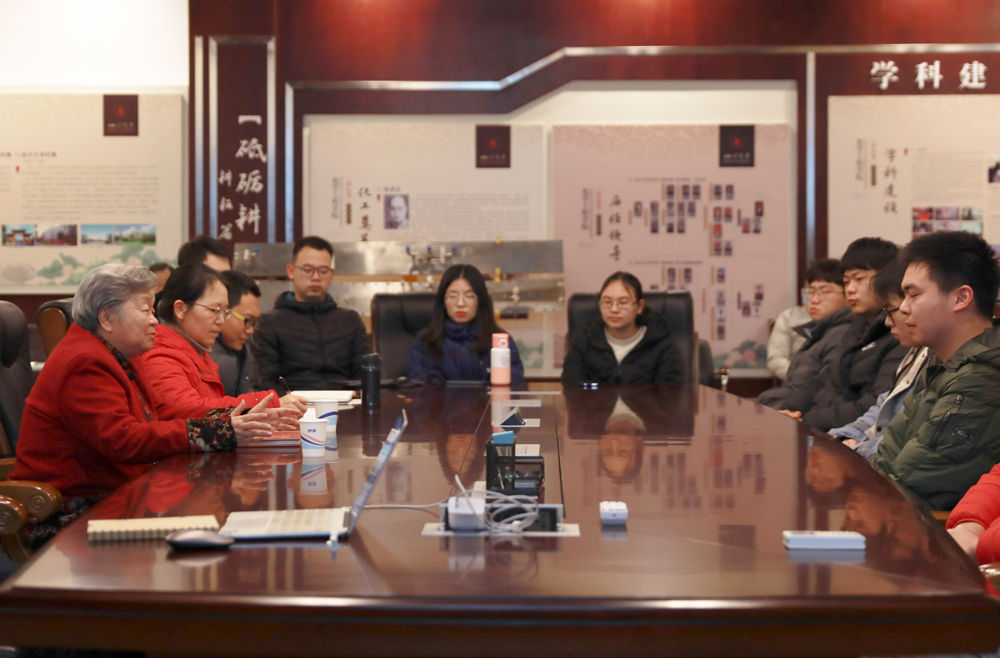 1月8日,钟本和(左一)在Mksport体育本科生毕业论文开题报告会上。