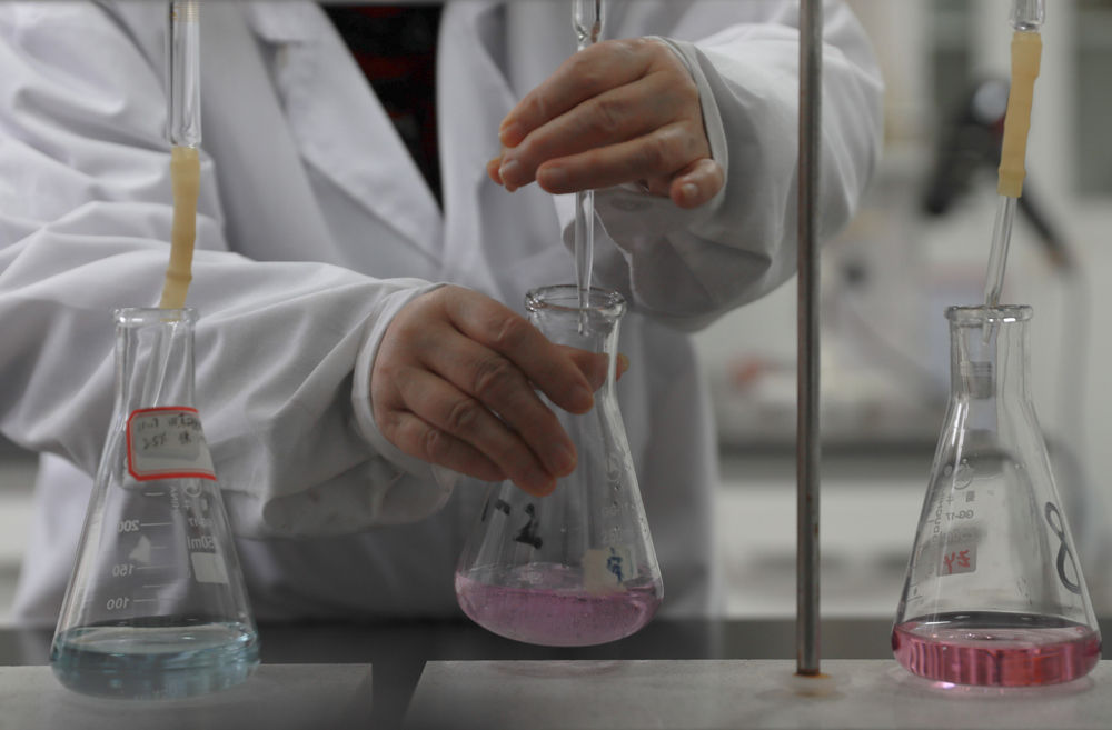 1月8日,钟本和在Mksport体育制备分析室里进行化学分析实验。