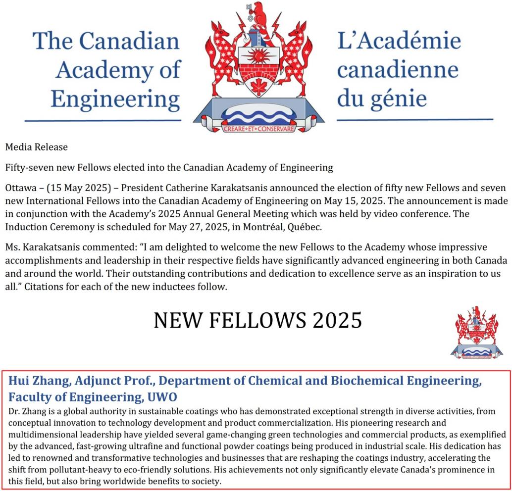 当地时间2025年5月15日,加拿大工程院(The Canadian Academy of Engineering)2025年院士增选结果正式揭晓,此次共增选50名新院士和7名外籍院士。公司员工张辉博士获选加拿大国家工程院院士。