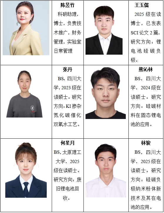 课题组以坚持绿色环保发展和建设新能源新材料美丽世界为教学和科研理念,主要从事于利用冶金法制备新能源材料、太阳能级多晶硅造渣精炼、稀有金属的分离提纯及废弃物循环利用回收等领域的研究,迄今在Carbon, ACS Applied Materials and Interfaces, Inorganic Chemistry, Journal of Cleaner Production, Industrial Engineering Chemical Research, Hydrometallurgy, Solar Energy and Solar Cells, Metallurgical and Material Transaction B等国际国内高水平学术期刊及学术会议上发表论文40余篇,授权中国发明专利8项,项目经费400余万。