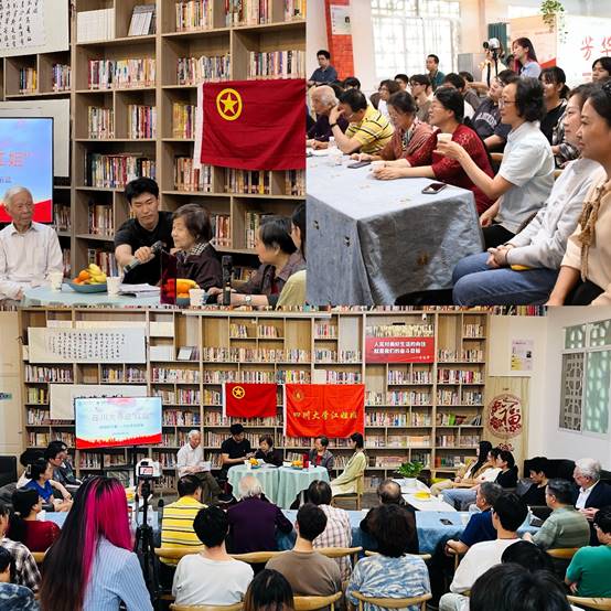 在新北村芳华服务中心内,大家聆听老革命金作美老师的“红色课堂”,分享了她的革命启蒙人——她父亲金善宝前辈、她在上海地下党和解放军的工作经历、她在俄罗斯留学所感受到的中俄友好建交与深厚情谊、她回到成都工公司对钒钛磁铁矿的创新性研究成果。也向我们讲述着一个红色书包、一把手枪、一块奶酪的故事,让那段信仰如磐的光辉岁月,鲜活地展示在同学们眼前。