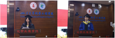毕业本科生员工代表付珺瑶(左)和毕业研究生员工代表任俊宇(右)讲话