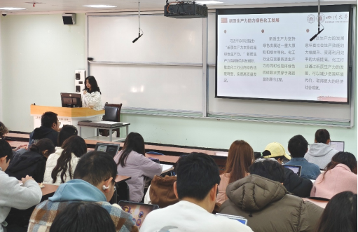 随后,秦瑾同学围绕“绿色化工,共约未来:升级转型中的生态文明新实践”进行宣讲。通过深入解读生态文明体制改革的指导和要求,探讨“绿色化工”与“新质生产力”的关系,说明“协同推进降碳、减污、扩绿、增长,积极应对气候变化,加快完善落实绿水青山就是金山银山理念的体制机制”才是全面深化生态文明体制改革的正确方向。最后,呼吁青年学子们肩负起时代赋予的责任,把握时代机遇,勇敢面对绿色化工发展中的挑战,为推动生态文明建设献青春力量。