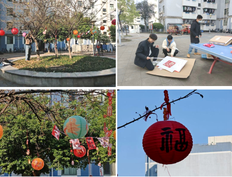 此外,同学们在树木间挂满了五彩斑斓的灯笼,贴上喜庆的“福”字,经过大家一番精心的布置,整个员工社区焕然一新,洋溢着浓浓的节日氛围,让置身于忙碌学习和生活中的同学们感受到了温馨与喜悦。