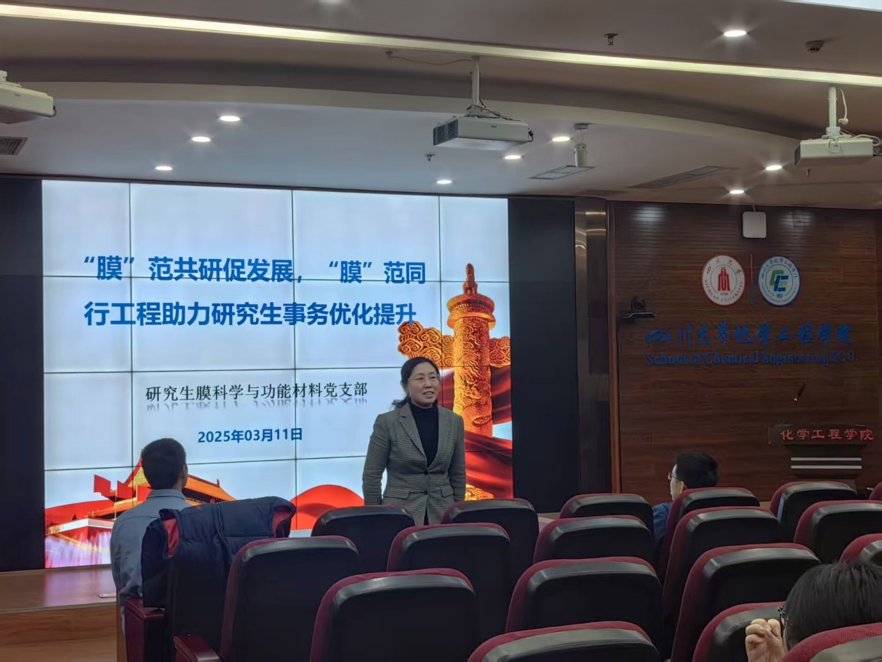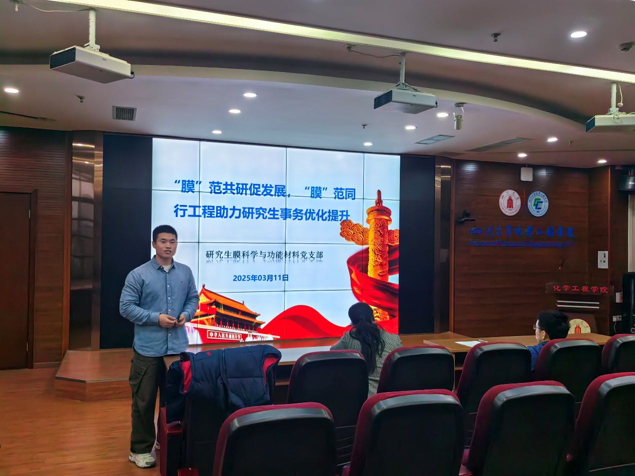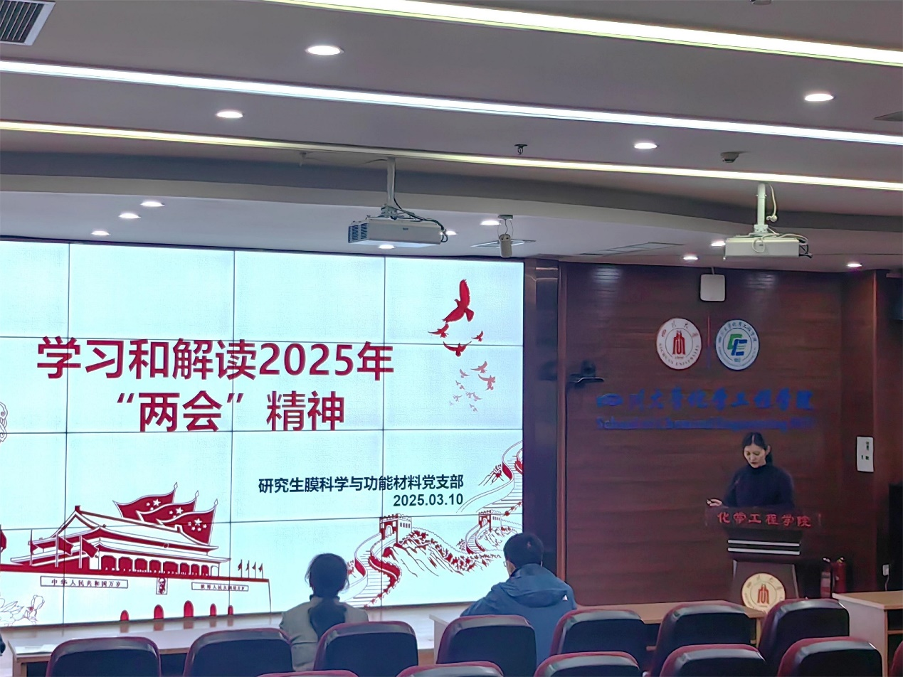 2025年3月4日、5日,全国政协十四届三次会议、十四届全国人大三次会议在北京召开。习近平总书记在参加江苏代表团审议时强调,今年是“十四五”规划的收官之年,要牢牢把握高质量发展这个首要任务。为深入学习贯彻全国两会精神,提升支部党员同志的思想政治素养,同时结合我支部“膜”范同行工程品牌推动研究生事务管理高质量发展,丰拓党建品牌内涵,膜科学与功能材料党支部于2025年3月11日晚在望江化工楼313室开展学习全国两会精神暨 “膜”范同行工程助力研究生事务优化提升组织生活。本次活动特别邀请公司副经理谢锐教授、化学工程系党支部书记汪伟教授共同参与。