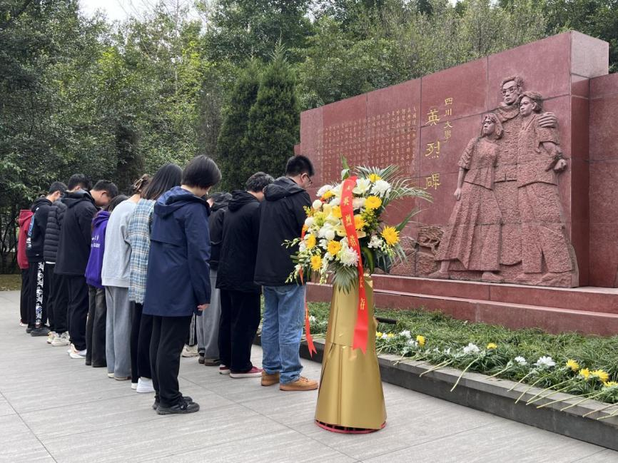 英烈碑前,气氛庄重肃穆,大家怀着崇敬的心情向革命先烈们默哀致敬。化工学子回顾川大英烈的革命历史,传承红色基因,赓续革命薪火。师生依次向英烈碑敬献鲜花,表达对革命先烈的崇高敬意和深深怀念。