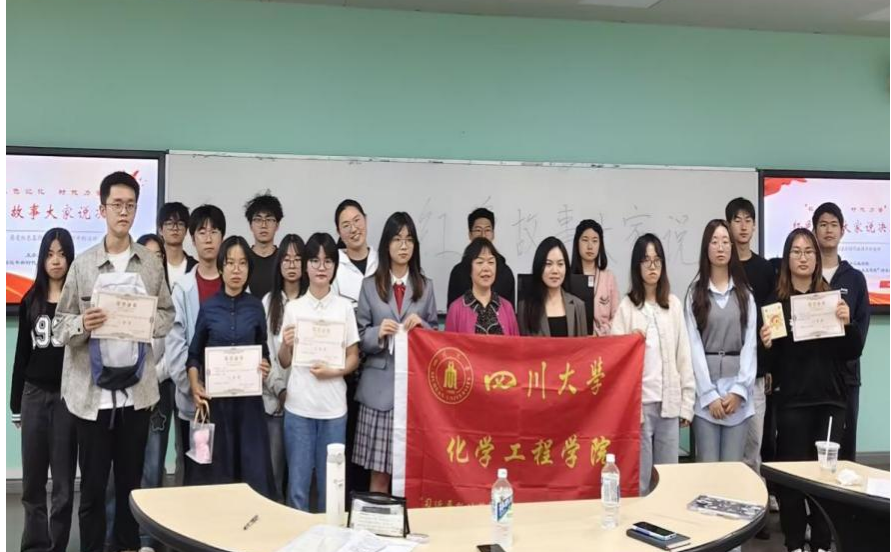 选手表演结束后,评委们根据故事内容、现场演绎等综合表现评选了获奖作品,袁玲和徐建勇老师共同为获奖同学颁奖并合影留念。
