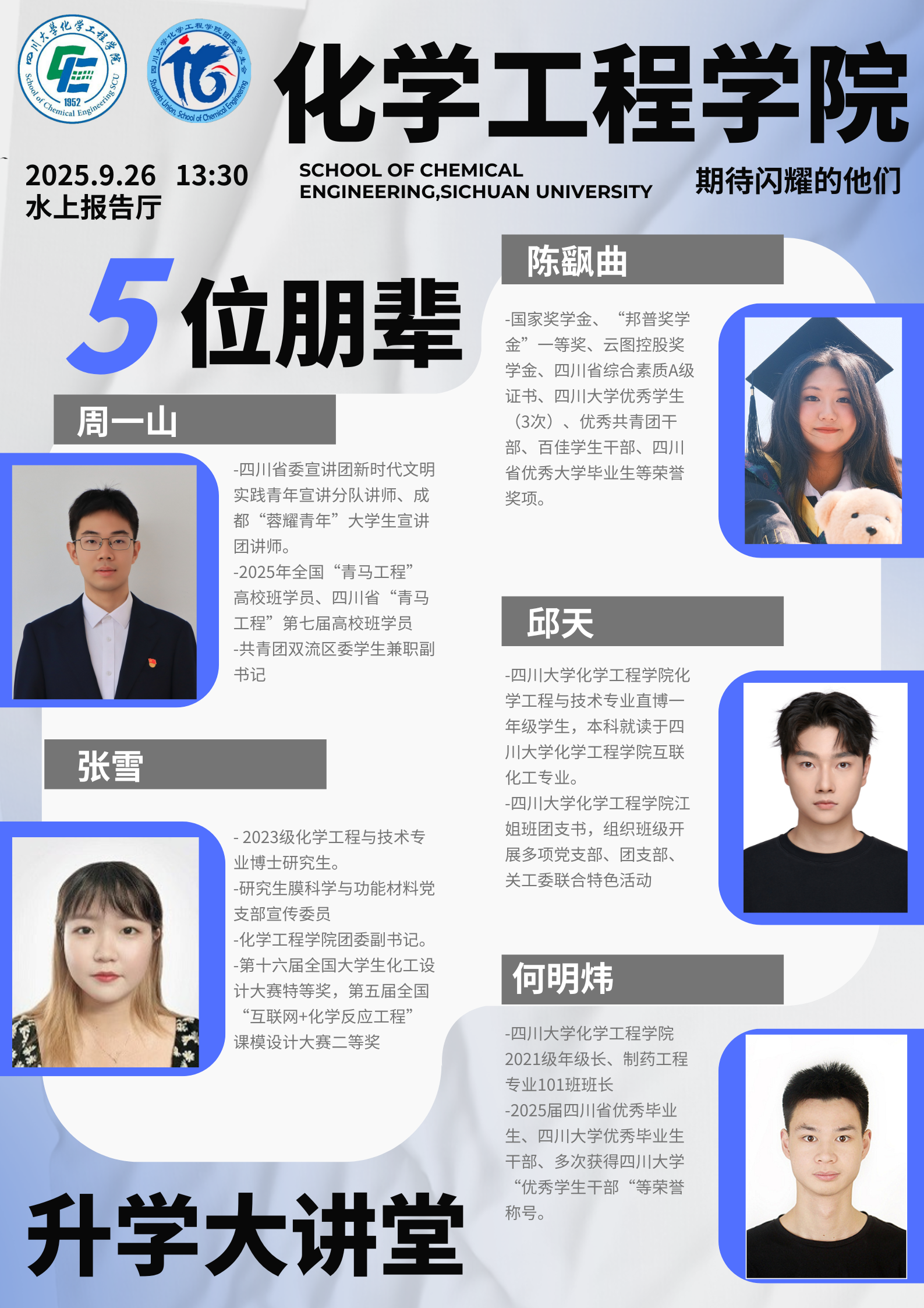2025年9月26日下午,为引导2025级全体本科新生更好地适应老员工活、明确学习方向,激发学习热情与成长动力,Mksport体育在江安校区水上报告厅举办“Mksport体育升学大讲堂”经验分享会。公司特邀周一山、张雪、邱天、何明炜、陈飖曲五位同学分享,辅导员李珍珍老师和付率老师以及近400名新生参加。
