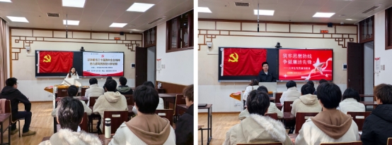 党课环节,本科社区党支部李珍珍同志以《深学细悟二十届四中全会精神奋力谱写民族复兴新征程》为题进行党课讲授,系统解读二十届四中全会精神的核心内涵与实践要求,阐述如何将全会精神转化为成才报国的实际行动;付率同志带来《强化纪律意识筑牢廉洁防线》专题教育,引导党员时刻绷紧纪律之弦,筑牢拒腐防变的思想防线。