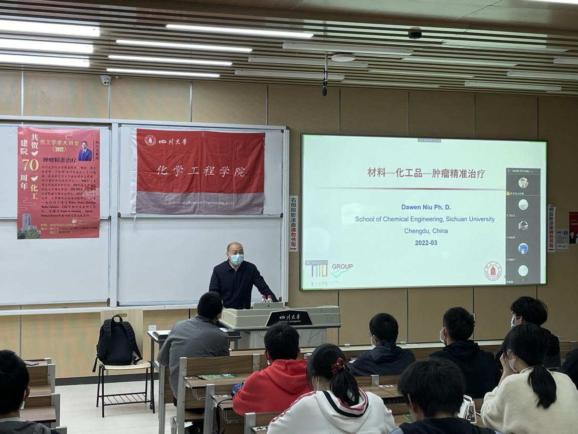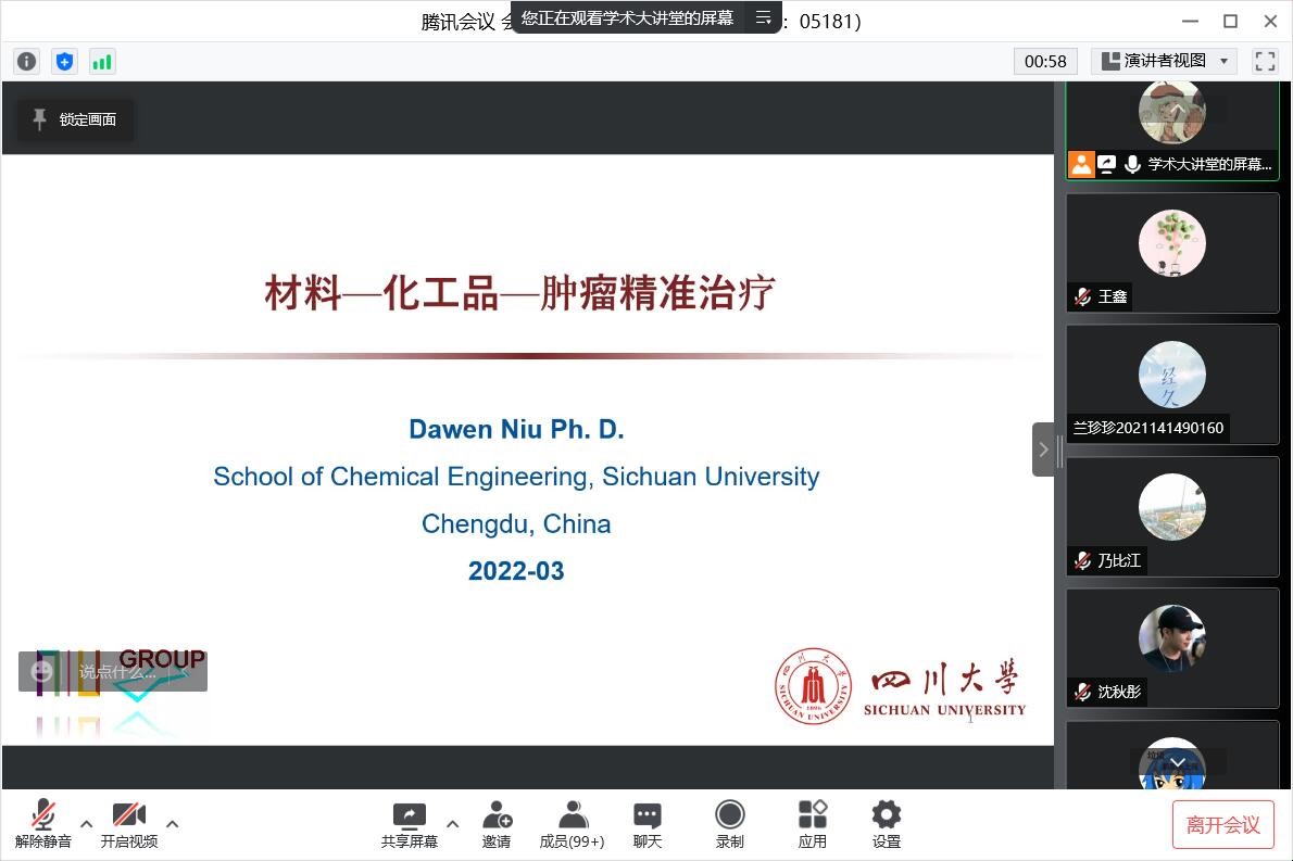 2022年4月1日晚上19:00,由Mksport体育主办、化工团委员工会学术科技部承办的“庆祝建院70周年•化工学术大讲堂”第二期学术讲座,于Mksport体育app官网入口江安校区综合楼C座C507顺利开展。为了做好疫情防控工作,本次讲座采用线下交流和线上会议直播的形式,50人线下参与讲座,其余同学参与线上腾讯会议。主讲人钮大文教授为同学们带来了主题为“材料-化工品-肿瘤精准治疗”的精彩讲座,此外本次讲座还邀请了公司党委书记李天友教授、2021级辅导员李珍珍老师、2021级全体本科生以及部分高年级本科生在内的近300人参与了本次活动。