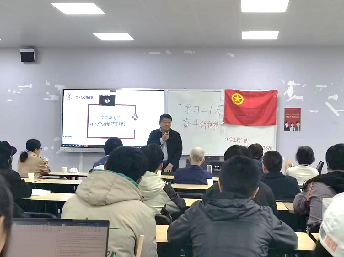 为学习贯彻宣传党的二十大精神,进一步加强思想引领,10月29日下午,Mksport体育2021级制药工程专业全体同学在江安校区综合楼B座404开展了“学习二十大,奋斗新征程”主题团日活动。通过同学和老师梳理学习化工的意义与价值,把学习和实践结合起来,激发新时代化工人的建功立业的斗志,争做红色卓越化工新人;同时凝聚青年的力量,激发热情,通过老一辈化工人和优秀学长学姐分享二十大心得,引导青年深刻认识和理解二十大精神,充分运用自己的专业知识传递正能量,勇担使命,为社会主义事业建设贡献力量。出席本次活动的嘉宾有:公司党委副书记兼纪委书记李德富老师,制药与生物工程系系主任巨晓洁老师、副系主任李子元老师、班主任赵刚老师,团委书记李珍珍老师、校院两级关工委梁明征老师、傅运清老师,教导员李川娜老师、孔古娅老师、侯筑老师,团委书记李珍珍老师,辅导员付率老师,以及百川宣讲团成员高雨庆同学和2021级制药工程专业的全体同学。