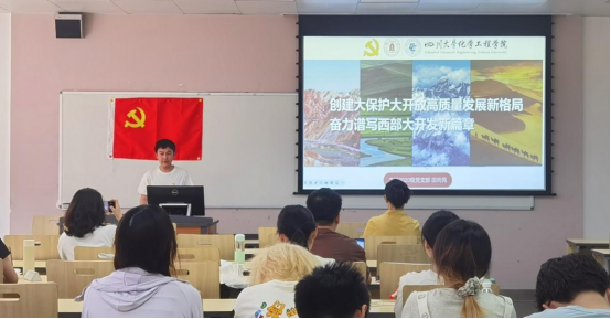 会议第二部分,员工党员进行主题领学。首先,田向民同志基于习近平总书记主持召开的新时代推动西部大开发座谈会,带领大家进行了以“创建大保护大开放高质量发展格局奋力谱写西部大开放新篇章”为题的深度学习。田向民同志主要就“什么是西部大开发”,“新时代西部大开放该如何作为”,“本次座谈会总书记做了哪些重要部署”这三个关键内容进行展开,带领党员同学领会西部大开发的重要性和必要性。