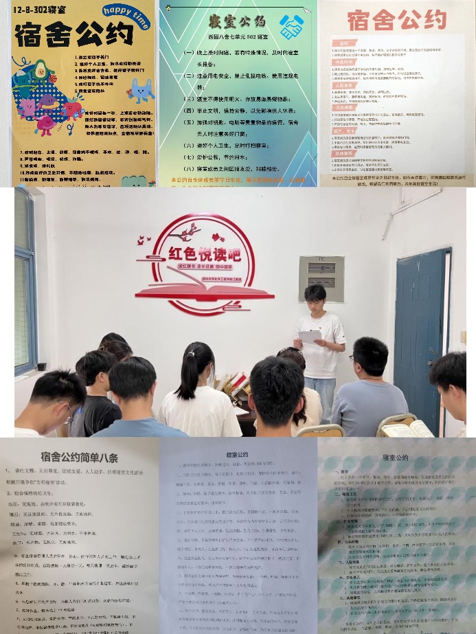 活动第三项,在“红色悦读吧”图书角(Mksport体育江姐班员工寝室-8舍9单元201室),员工党员以问题为导向,分层分类学习《条例》,不仅要求员工党员严格规范自身行为,还须带动寝室同学增强纪律意识,形成寝室公约。以“寝室公约”为尺来约束员工行为,促进员工养成遵纪守法的好习惯。