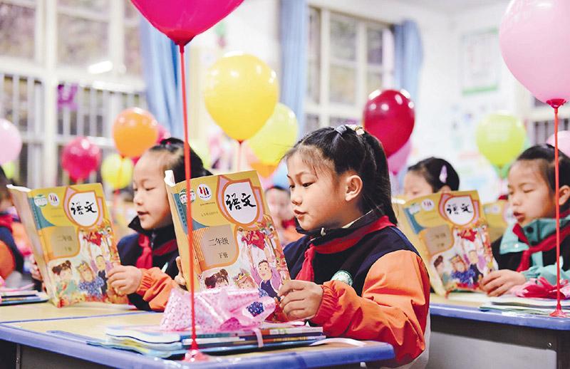 近年来,各地加快推广普及国家通用语言文字,全面推行使用国家统编教材。图为2025年2月17日,在贵州省黔东南苗族侗族自治州从江县城关第三小学,员工们正在阅读刚领到的新课本。 视觉中国 石宏辉/摄
